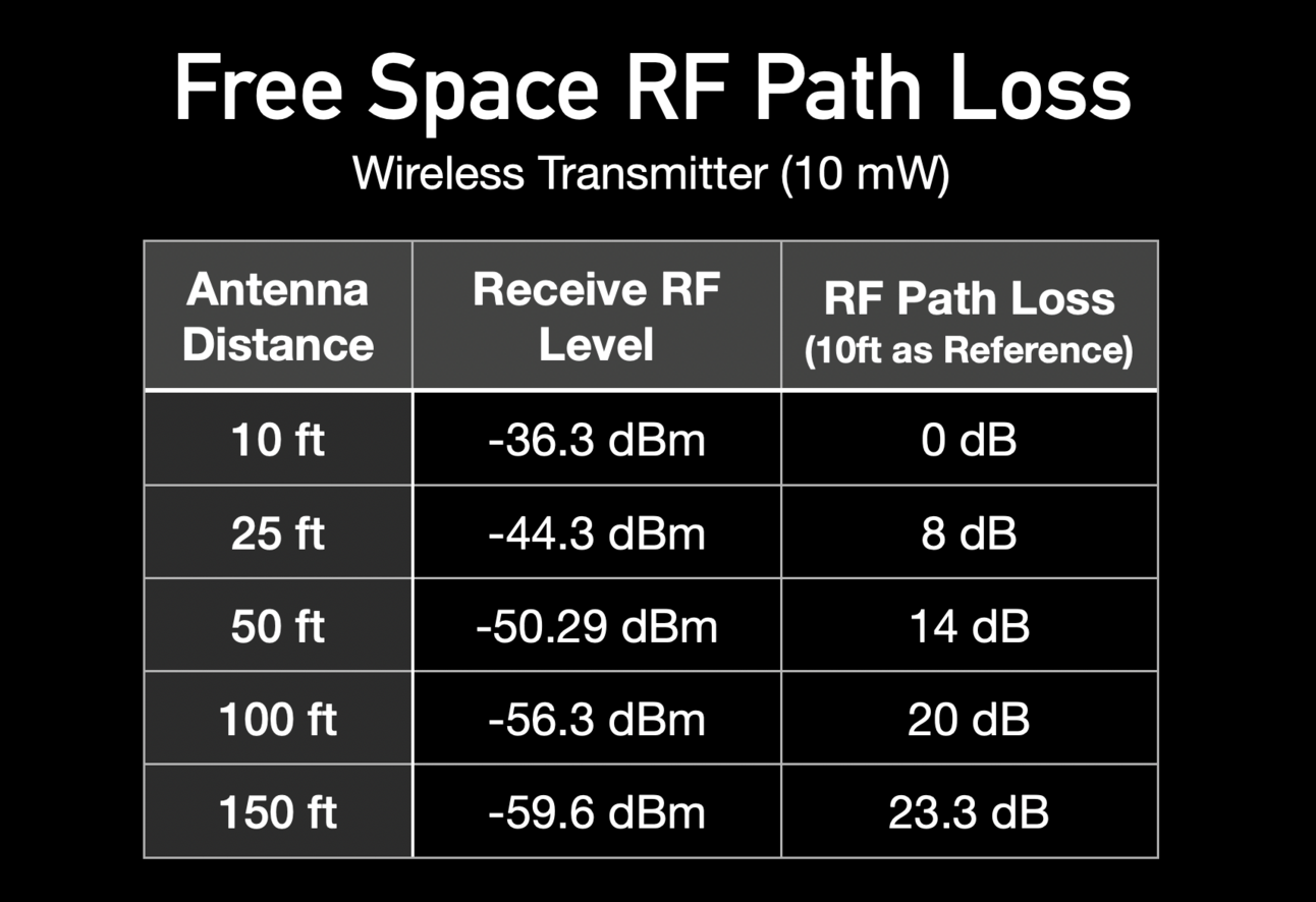 Let’s focus on 50 feet—a common distance for FOH sound booths from the stage. At 50 ft, you get 14 dB more loss than you would if the antenna were just 10 ft away.