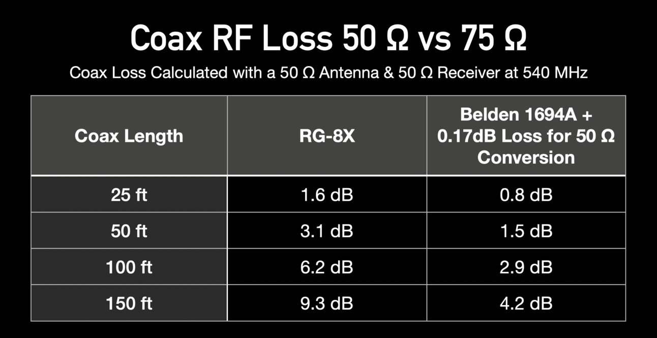 ❌ Don’t use 75-Ohm Cable for IEM transmitters—the 1.5:1 SWR can harm your transmitter.