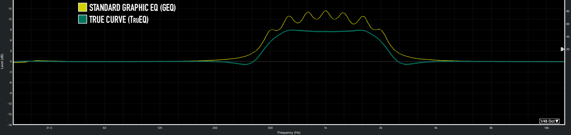 The difference: True Curve calculates the interaction between bands and compensates for it. Standard Graphic EQ behaves like traditional hardware and lets those bands stack.